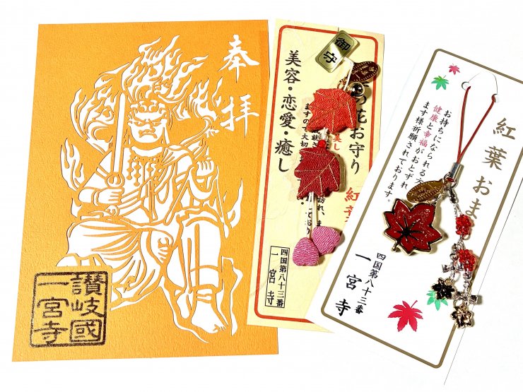 秋の切り絵御朱印は、一宮寺護摩堂のお不動さまをモチーフにしております。なぜ、お不動さまなのかと言うと、お不動さまをお祀りしている護摩堂の落慶が紅葉の色づき始める秋(2006年)だったからです。一宮寺では、秋になるとお不動さまに思いを馳せる、そのような意味が込められております。是非この機会にご参拝いただければ幸いです。
